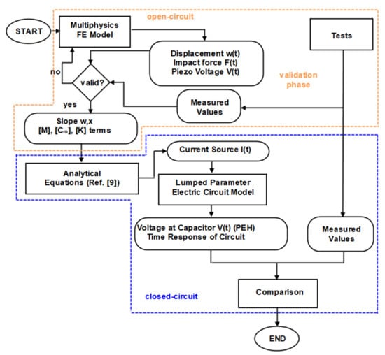 The objective of the experimental-numerical method developed here is the prediction of the electric power that can be harvested during impacts which start vibrations on composite beams with piezoelectric patches connected to PEH circuits. The methodology evolves in two stages, indicated by the orange and the blue dotted lines in the flowchart shown in Figure 1.