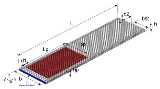 Composite beam with PE patch: FE mesh and geometric parameters.