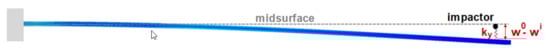 where the index i denotes the impactor, (x0, y0) are the coordinates of impact on the midsurface and ky is the contact stiffness derived by material and geometric properties []. The contact law of Equation (6) is represented schematically by interposition of a linear spring with stiffness ky between beam and impactor, as shown in Figure 3.