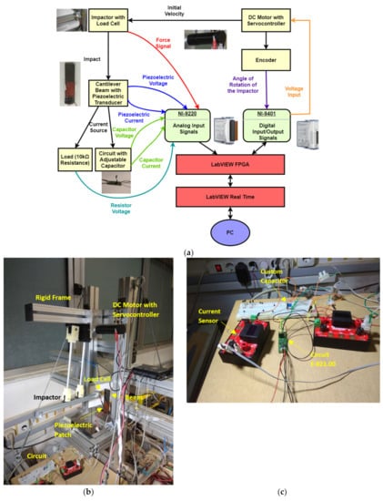 Solution of Equation (5) provides the time profile of displacements of the composite beam and the electric potential at the terminals of the open-circuited piezoelectric transducer, which in this case acts as a sensor. The time profile of impact force may be predicted using Equation (6) and used as input for predicting electric current in a harvesting circuit, as explicitly described in the following section.