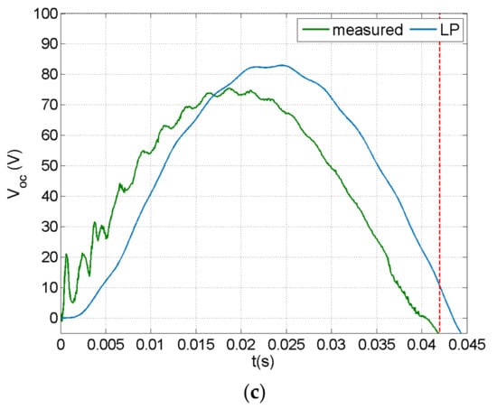 The LP model could predict the general signal trends, but missed the initial fluctuation during impact. This trend was more evident before rectification (Figure 9). As already observed in the open-circuit case (Section 4.1), parameters not included in the impact modelling approach, such as the deformability of impactor and clearance in the force sensor assembly, strongly affected the fluctuation in the dynamic response during the initial phase of the impact event. Nevertheless, this methodology could predict the limit values of impact-induced signals and therefore could be used as a design tool for PEH circuits in applications related to low-velocity impact events.