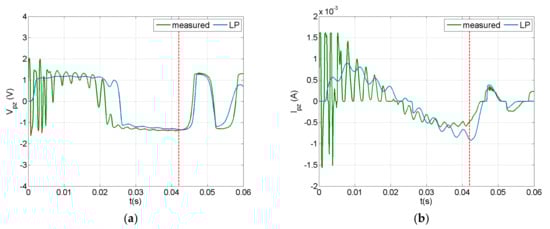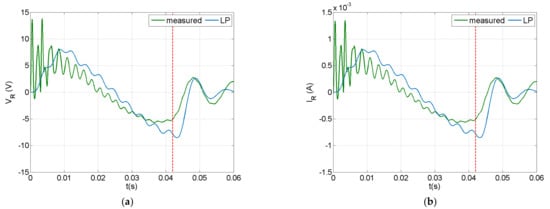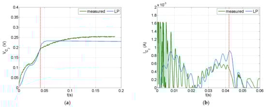 Predictions of the lumped parameter (LP) model for the resistor voltage and circuit current are compared with measurements in Figure 8a,b, respectively. The LP model predictions followed the measured trends for both the resistor voltage and circuit current, but missed the fluctuation measured during the initial impact phase. The change of sign in both graphs during impact indicates that the impactor moved backwards when it lost contact with the beam. The free vibration which followed the impact event, provided a smoother signal, which contained practically the first bending mode.