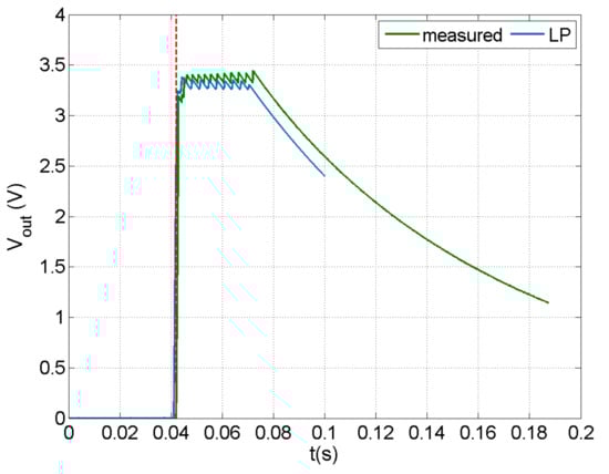Predicted and measured voltage in the output of the discharging subcircuit in the case of a PEH circuit with capacity of 2.7 μF.