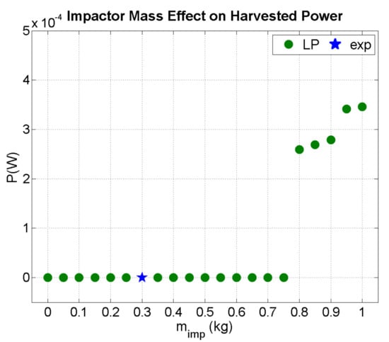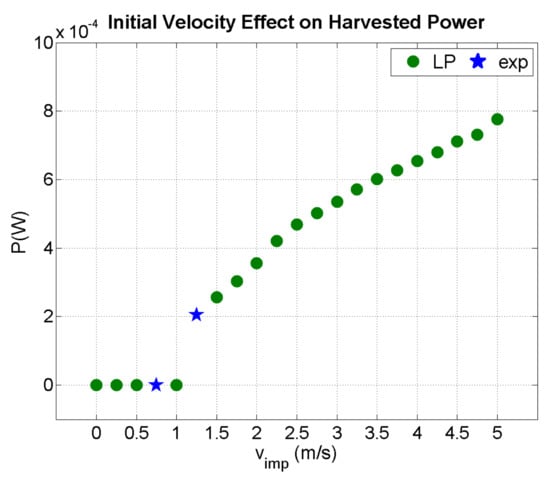 Figure 12 illustrates the effect of initial impactor velocity on the harvested power. The blue stars indicate experimental data, while the green circles are predictions of the present LP model for an impactor mass of 0.3 kg. For velocities exceeding 1 m/s, the beam acted as a harvester. Power increases had two discrete slopes. However, a precise prediction of the harvested power at high velocities requires a thorough study of the mechanical response of the beam in terms of geometric linearity and mechanical strength, which is beyond the scope of the current work.