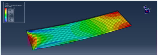 In addition to the prediction of harvested power, the current methodology can be used as a design tool for prediction of the structural integrity of a structure subjected to impact. The prediction of the impact force–time profile, as presented in Figure 7, provides an overview of the impact event and the timestamp of maximum impact force. Figure 14 illustrates the longitudinal stress distribution at ply 3 of 12 at maximum impact force in the case of an impact of a 0.3 kg mass with a velocity of 4 m/s. This ply has a 90° fiber orientation with respect to the coordinate system presented in Figure 2. In specific regions, the compressive stress exceeded the compressive strength of the epoxy matrix (158 MPa) []. This prediction dictates that an additional design loop is required to ensure the structural integrity of the harvesting system and tune its harvesting capability by properly setting the capacity of the output subcircuit.