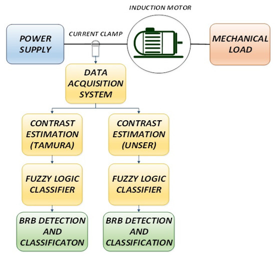 The proposed methodology to detect and classify incipient BRB faults in an IM through the analysis of its steady-state electric current signal by means of contrast calculation and fuzzy-logic categorization is depicted in Figure 4.