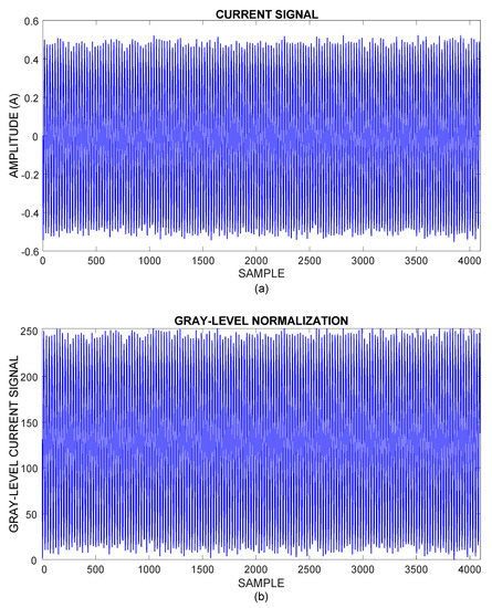 Figure 5a shows the steady-state current signal from one phase of the power supply feeding the induction motor. The acquired current data are taken into gray scale levels from 0 to 255 through a linear conversion, without modifying the electric current waveform as depicted in Figure 5b.