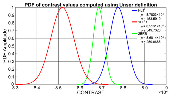 PDFs from contrast values computed through Tamura definition for a healthy motor (HLT), a motor with one broken rotor bar (1BRB) and a motor with two broken rotor bars (2BRB).