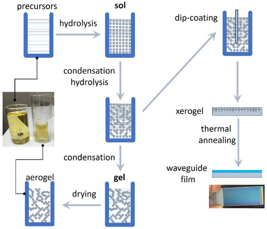 In our research, we consider the use of low-propagation-loss SiO2:TiO2 WG layers that are fabricated using sol–gel-derived deposition method with a dip-coating technique. This technology has been mastered at the Silesian University of Technology [6]. The fabrication procedure is depicted schematically in Figure 1, as quite a straightforward method and does not require an expensive setup.