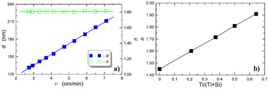 The possibility of precisely controlling the SiO2:TiO2 WG film thickness and the refractive index was investigated by the procurement and characterization of a series of films fabricated with different SiO2:TiO2 precursor ratios and different substrate withdrawal speeds from the sol. Fabricated WG films were investigated using the optical ellipsometry technique; the obtained results are shown in Figure 2.