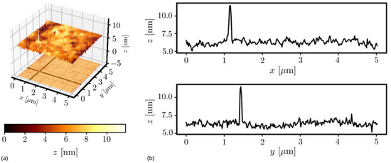 The surface topology of SiO2–TiO2 films fabricated on soda–lime glass substrates was investigated using atomic force microscopy (AFM). An exemplary AFM image (left) and two-axis top-surface line scans (right) are shown in Figure 3.