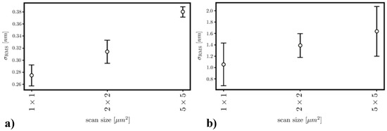 The selected sample was measured in nine different spots using the Ntegra Spectra system. Eight spots were located on the circumference of a square with dimensions of 10 × 10 mm2. The last, the ninth, was located in the center of that square. There were registered scans of fields having dimensions of 5 × 5 µm2, 2 × 2 µm2 and 1 × 1 µm2, three per each size. This enabled determining the dependence of root mean square surface roughness σRMS and its maximum deviation from the average on scan dimensions, as presented in Figure 4.