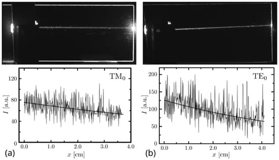 The experiment demonstrated in Figure 5 clearly shows that the fabricated WG films have very good properties in terms of light propagation. Based on the demonstrated intensity profiles, the value of the propagation loss for these WG films has been estimated to be α = (0.34 ± 0.03) dB/cm for TM0 mode and α = (0.71 ± 0.08) dB/cm for TE0 mode.