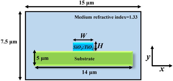 Figure 6 presents a schematic representation of a WG structure that will be investigated hereafter. It is a ridge WG composed of a SiO2:TiO2 core deposited on a standard glass substrate. The width and height of the WG core are denoted as W and H, respectively. The refractive indexes of the core and substrate were fixed at 1.8 (see Figure 2) and 1.5135 [18], respectively, which corresponded to the refractive index of fabricated WG films. The WG was placed in an aqueous medium of refractive index = 1.33. The numerical analysis was conducted via a 2D finite element method (2D-FEM) in COMSOL Multiphysics software. The entire device structure was divided into triangular elements with a predefined “Extremely fine” mesh grid size. The effective refractive index of the propagating mode was calculated for a WG of different heights and utilized to solve the problem. Scattering boundary conditions (SBCs) were applied on the outer boundary of the WG geometry to make the boundary transparent for the scattered electromagnetic waves. The sensing capability of the abovementioned platform was analyzed by modelling the RR structure for refractive index sensing applications.
