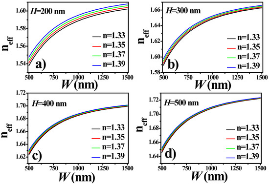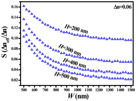 where Δneff and Δn are the change in the effective refractive index and change in ambient refractive index, respectively. From Figure 9, it can be seen that the propagating mode is highly responsive to the ambient medium at small values of H and W. For instance, a mode sensitivity of 0.162 Δneff/Δn was acquired for the WG geometry of W = 500 nm and H = 200 nm for Δn = 0.06. On the other hand, the sensitivity of the WG reduced to 0.097 Δneff/Δn at W = 1500 nm and H = 200 nm. Further reductions in sensitivity were noticeable as H increased to 500 nm. However, the highly sensitive devices produced a drawback of high propagation loss of the mode. Therefore, there is always a compromise between high sensitivity and high optical losses.