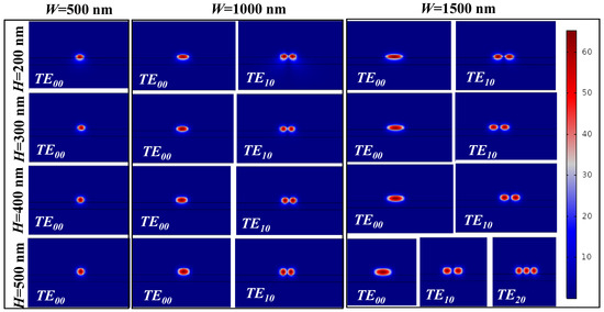 For optical communication or sensing applications, single-mode WG operation is appropriate. Therefore, neff calculation for WG geometry is an initial step to designing WGs of any type. In Figure 8, the normalized E-field distribution of the TE-polarized mode is plotted. For W = 500 nm, the WG supports a fundamental mode for H = 200 nm, 300 nm, 400 nm and 500 nm. However, as W approaches 1000 nm and beyond, the WG geometry starts supporting higher-order modes (TE10 and T20). Therefore, special attention should be given while designing optical devices where single-mode operation is desirable.