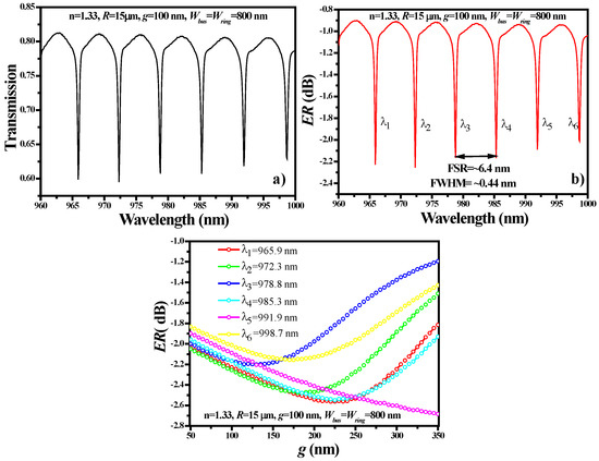 Spectral characteristics of the RR structure: (a) transmission spectrum, (b) FSR versus ER, (c) optimization of g. Geometric parameters such as R = 15 μm, g = 100 nm, Wbus = Wring = 800 nm and n = 1.33 are used.