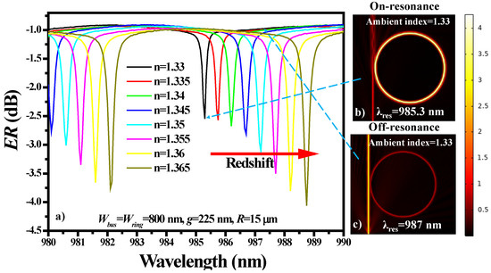 (a) Transmission spectrum of the RR structure in the presence of different ambient refractive indices. Normalized E-field distribution in the RR structure in the (b) on-resonance state and (c) off-resonance state. The geometric parameters of the structure are as follows: R = 15 μm, g = 225 nm, and Wbus = Wring = 800 nm.