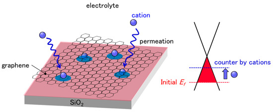 Schematic illustration of cation permeation into polymer residue and/or between graphene and SiO2 substrates. Graphene is initially p-doped by the effect of PMMA residue and SiO2 substrate. The diffusion of cations, which have n-doping effects to graphene, has a counter-effect on initial p-doping, resulting in CNP drifts.