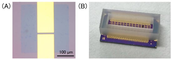 (A) Optical image of a GFET, in which a patterned graphene sheet is bridged between source/drain electrodes. Scale bar is 100 µm; (B) a photo of a device chip. A silicone rubber container was set onto the chip to hold a solution on GFETs.