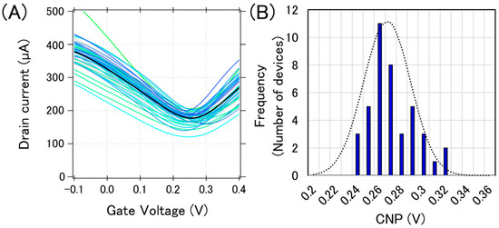 Figure 3A shows the typical transfer curves measured from a chip, where 40 GFETs were integrated. The bold black line in Figure 3A is the calculated average transfer curve. There are three types of variations in electrical characteristics: (i) current variation, (ii) CNP variation, and (iii) transconductance variation. These variations in the transfer curves may be attributed to the graphene tearing, PMMA residue on the graphene, and the impurity charge from the substrate. We previously reported that graphene tearing increases the resistance and decreases the transconductance [22]. It was also reported that both the PMMA residue and SiO2 substrate have a p-doping effect on graphene [23,24,25]. Moreover, water molecules also have a p-doping effect on graphene [26]. Therefore, our GFETs are expected to be p-doped, and it was proven that the observed CNPs were positive, as shown in Figure 3.