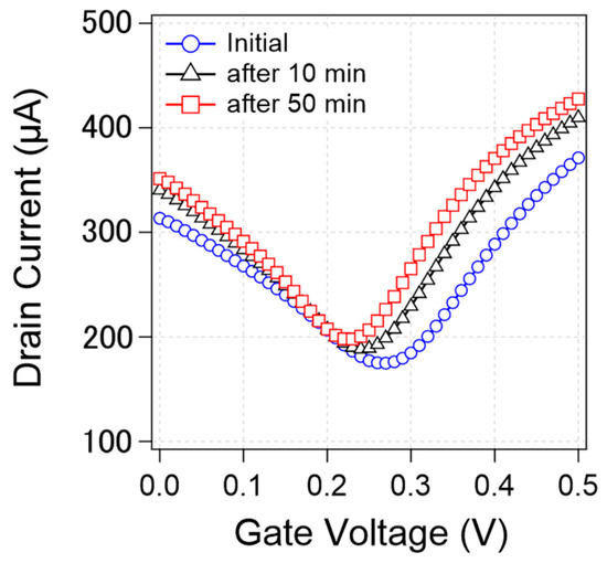 Change of transfer curves from a specific device during measurements. Initial transfer curve (blue circle) and the transfer curve after 10 min measurement (black triangle) and 50 min measurement (red square).