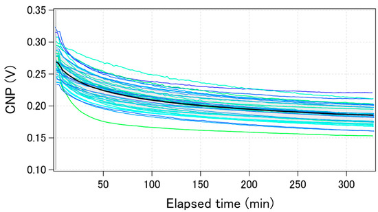 Time-course of the calculated CNPs during electric measurements for the same 40 GFETs in Figure 3. The black bolded line shows the calculated average value.