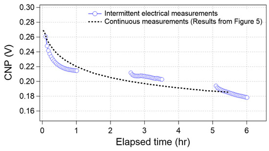 Time-course of the CNP value during intermittent electrical measurements (blue circle) and continuous measurements (results from Figure 5, black broken line).