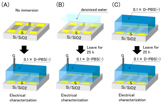 Because the drift was not affected by the electrical effects, we inferred that the electrolyte solutions were responsible for the drift. Put simply, the water molecules and/or ions in contact with the graphene were attributed to the drift. As the effect may differ depending on the solution, we immersed the GFETs into two different solutions, with and without ions, prior to the electrical measurements. The experimental procedure is illustrated in Figure 7. The GFETs were first immersed in deionized water or 0.1 × D-PBS(-) for 25 h as pre-treatments. Subsequently, the solution used in the pre-treatments was replaced with 0.1 × D-PBS(-), and electrical measurements were conducted. The results were compared with the initial properties, as shown in Figure 3.