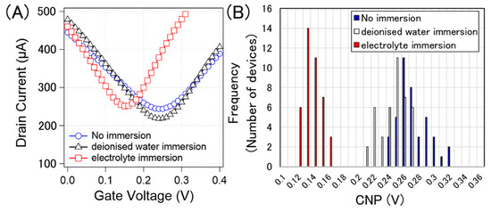 Figure 8A shows typical examples of the transfer curves without pre-treatment, after deionized water immersion, and after electrolyte immersion (0.1 × D-PBS(-)). Figure 8B shows the histograms of the CNPs corresponding to each process. The calculated average and standard deviation of the CNPs from 40 devices for water immersion, electrolyte immersion, and non-treatment were 267 ± 21 mV, 240 ± 17 mV, and 132 ± 11 mV, respectively. Figure 8 indicates that the pre-treatments were effective in suppressing p-doping. It is known that water molecules are slowly intercalated between graphene and substrates [31,32]. This intercalation may potentially weaken the p-doping from the substrate, resulting in slight n-doping by water immersion. Although the effect of water immersion was not certain, the effect of electrolyte immersion was apparent n-doping on the GFETs. The results indicate that the ions were the main n-dopants. Jia et al. demonstrated that ions slowly penetrated between graphene and substrates, and graphene was gradually n-doped over time [33]. This phenomenon should also occur in the proposed system.