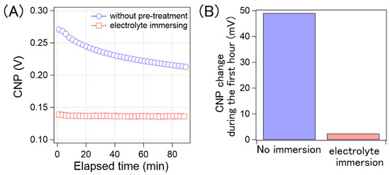 (A) Time-course of the calculated average CNP of the GFETs without the pre-treatment (blue circle) and with the electrolyte immersing (red square); (B) the CNP shift amount of the GFETs without the pre-treatment and with the electrolyte immersing during the first hour.
