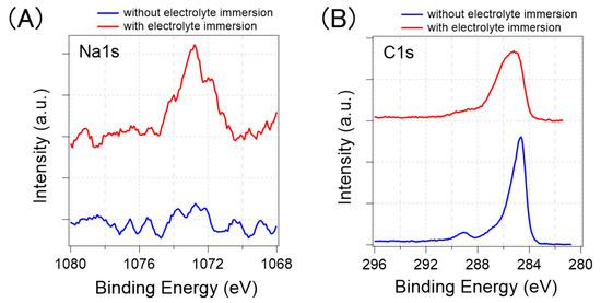 XPS analysis results of graphene with (red line) and without the electrolyte immersion (blue line). (A) Na1s peak (B) C1s peak.