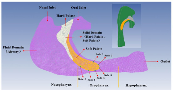 In this paper, the Young’s modulus of the soft palate was set as 1 MPa and a Poisson’s ratio of 0.49 was used; the density was 1000 kg/m3. The Young’s modulus of the hard palate was set as 13.7 GPa and a Poisson’s ratio of 0.3 was used; the density was 1850 kg/m3. The medium in the fluid field was air and the density and dynamic viscous coefficient were 1.7894 × 10−5 kg/ms and 1.225 kg/m3, respectively. In addition, the upper airway was treated as an instantaneous rigid body and the fluid was considered incompressible. The change in the temperature field during the simulation was neglected, and the effect of gravity on the soft palate in the supine position was considered. A complete respiration cycle was simulated.