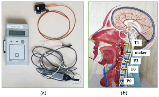 The patient was monitored using ApneaGraph AG 200 (MRA-Medical Ltd., Gloucestershire, UK), as shown in Figure 4, for 6–8 h at night, and comprised micro-pressure and temperature transducer catheters. The procedures were to first sterilize the piezometer tube with glutaraldehyde, then select one nostril of the patient, which was comparatively unobstructed, and administer aerosols of ephedrine followed by tetracaine to the selected nostril and oropharynx. With the anesthesia administered and after a 10 min wait, tube insertion operation began by inserting the piezometer tube via the anaesthetized nostril. When the metal marker was at the highest level of the free end of soft palate, the pressure sensors, P0 and P2, were positioned at the mid-section of the esophagus and at the oropharynx beneath the free edge of soft palate; thermal sensors T1 and T0 were located in the nasopharynx and hypopharynx, respectively.