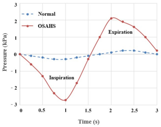 Pressure data obtained during the typical 3-s respiration cycle in cases of eupnea and apnea are shown in Figure 5. The red solid line denotes the pressure in apnea while the blue dashed line denotes the pressure in eupnea. The markers denote the data obtained from the clinical pressure measurement from the sensor. The clinically measured pharyngeal pressure from the ApneaGraph AG 200 was used to assigned the boundary condition at the outlet of the upper airway in the FE model. At the airflow inlet (the nasal cavity of the model), a pressure of 1 atm was exerted. All respirations mentioned in the processes above refer to nasal respirations.