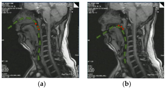 In contrast, Yucel [24] reported that the retropalatal and retroglossal regions of both healthy people and OSAHS patients have smaller cross-sectional areas in the exhalation phase than in the inhalation phase. Other studies [15,25,26,27] reported that collapse of the airway occurs at the end of the exhalation phase; however, the mechanism causing the collapse is still unclear. Morrell et al. [25] suggested that the lung volume of OSAHS patients under sleeping conditions decreases at the end of expiration, making their upper airways more prone to collapse. Zhu et al. [15] simulated the movement of the soft palate of an individual under normal breathing conditions using a fluid–solid coupling technique. They found that the movement of the soft palate during expiration is much greater than that during inspiration. The continuous decrease in the volume of the retropharyngeal cavity due to the movement of the soft palate towards the retropharyngeal wall could trigger a blockage of the airway at the end of expiration.