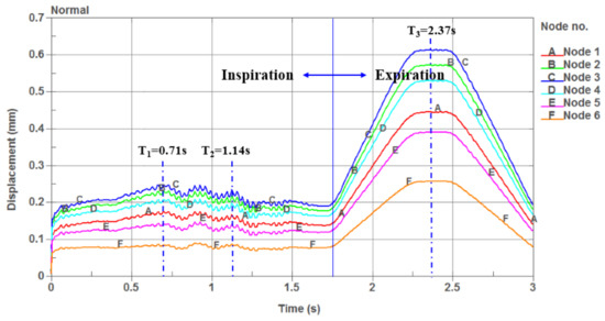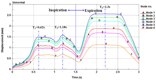 The locations of the six nodes are indicated in Figure 3. Figure 7 shows that the maximum displacements of the nodes in the expiration phase are much greater than those in the inspiration phase. In the inspiration phase, the maximum displacement occurs at T2 = 1.18 s and has a magnitude of 1.667 mm, at which point the soft palate moves to the anterior wall of the pharynx, as shown in Figure 8b. During the expiration phase (T = 1.8–2.6 s), the displacement of the soft palate fluctuates around the peak value (maximum displacement) with a magnitude of 2.628 mm; it occurs at T3 = 2.3 s and then the soft palate moves to the posterior wall of the pharynx, as shown in Figure 8c.