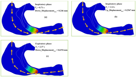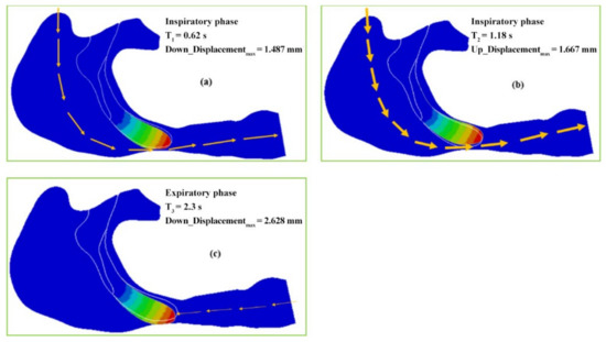 In Figure 8, the airflow is indicated by arrows. The arrows with thicker lines denote a better ventilation and a patent airway, and the arrows with thinner lines denote a lower ventilation and a narrower airway. The original position of the soft palate profile before a new cycle of respiration begins is plotted with a white line for the patient who is sleeping in a supine position under eupnea. Figure 8a shows that when T1 = 0.62 s, the soft palate moves to the posterior wall of the pharynx with a displacement of 1.487 mm, narrowing the airway and causing difficult passage of airflow during the inspiration phase. The impact of airflow is prone to cause vibrations of the soft palate and then the patient snores. Figure 8b shows that when T2 = 1.18 s, the soft palate moves to the anterior wall of the pharynx with a displacement of 1.667 mm. The airway reopens and the airflow can easily pass through the airway during the inspiration phase. Figure 8c shows that T3 = 2.3 s, the soft palate moves to the posterior wall of the pharynx with a maximum displacement of 2.628 mm during the expiration phase. The airway is stenosed and the airflow cannot pass with ease.