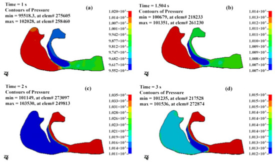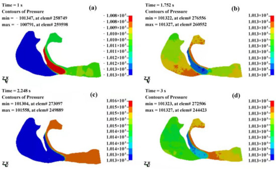 The pressure distributions of the fluid field of the OSAHS patient’s upper airway under the state of apnea (pressure unit in Pa). (a,b) The inspiration phase; (c,d) the expiration phase.
