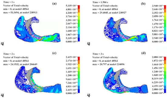 Figure 10a shows that the soft palate moves to the posterior wall of the pharynx with a displacement of 0.246 mm, and the airflow can easily pass through the airway during the inspiration phase at T1 = 0.71 s. Figure 10b shows that the soft palate moves to the interior wall of the pharynx with a displacement of 0.2367 mm at T2 = 1.14 s. The airway is opened more and the airflow can more easily pass through the airway during the inspiration phase. Figure 10c shows that when T3 = 2.37 s, the soft palate moves to the posterior wall of the pharynx with the maximum displacement of 0.6194 mm, and the airflow can still pass through the pharyngeal cavity at that time and go out from the nasal cavity during the expiration phase.