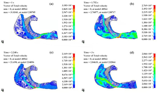 Figure 9 shows that the maximum displacement of the nodes in the phase of expiration is much greater than that in the inspiration phase. During the inspiration phase, the maximum displacement is 0.2778 mm and occurs at T2 = 1.14 s, at which point the soft palate moves to the anterior wall of the pharynx, as shown in Figure 10b. During the expiration phase, the displacement fluctuates around the peak value during the time interval T = 2.2–2.4 s, and the maximum displacement (0.6194 mm) occurs at T3 = 2.237 s, at which point the soft palate moves to the posterior wall of the pharynx, as shown in Figure 10c.