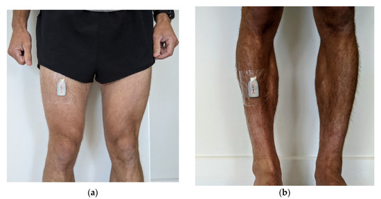 Experiment setup for activPAL PAL 3 in both positions: (a) thigh worn PAL3 for measuring postures; (b) shank worn PAL3 for measuring 3-axis accelerations.