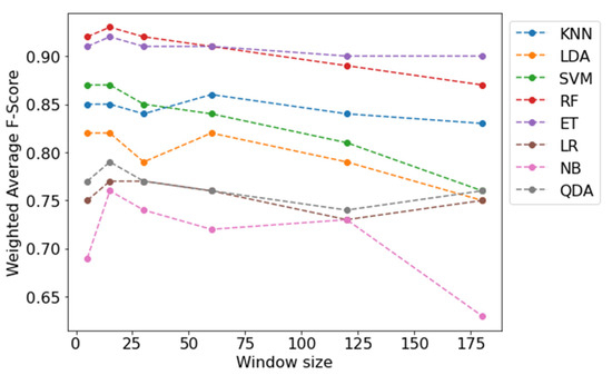 The F-scores for each model and window length are shown in Figure 2. For every model other than the KNN, the 15 s window length achieved the highest F-scores, while there was a trend of poorer performance as the window length increased, with the 120 and 180 s windows performing the worst. The RF classification model achieved the best individual result of 93% compared to the poorest result of 63% from NB with 180 s window length. On average, the RF and ET algorithms performed the best with 91% average F-scores across all window lengths, followed by KNN (86%), SVM (83%), LDA (80%), QDA (77%), LR (76%), and NB (71%).