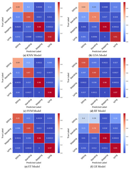 Confusion matrices show the percentage of misclassified postures for each class (Figure 3). Across all the classifiers, misclassified sitting postures were more likely to be classified as standing postures (11–39%). Similarly, misclassified standing postures were more likely classified as sitting postures (1–20%). Although lying postures were consistently classified correctly, those few misclassifications were more likely to be classified as either of the other static postures (<1–10%), whereas stepping postures were most likely misclassified as standing (3–6%).