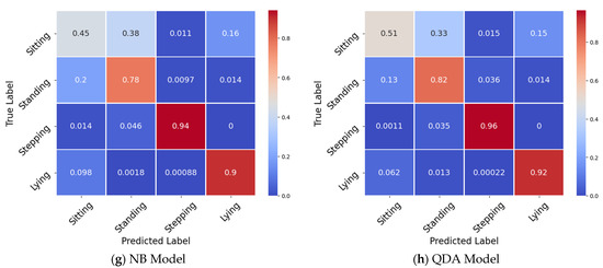 Confusion matrices for each classifier utilizing a 15 s window length: (a) KNN, (b) LDA, (c) SVM, (d) RF, (e) ET, (f) LR, (g) NB, and (h) QDA.
