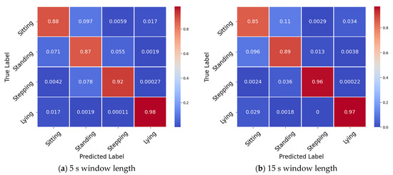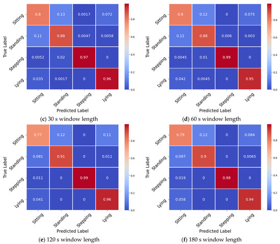 Confusion matrices for the different window lengths for the best performing RF classifier are shown in Figure 4. As the window length increased, there was a trend of increased misclassification when trying to predict sitting postures (12% 5 s window length and 21% 180 s window length) and, conversely, a small increase in performance at classifying standing postures (13% 5 s window length and 10% 180 s window length). Increasing the window length from 5 s to 15 s improved stepping posture classification by 4%. This gain in performance slowly grew to 99% accuracy for the 120 s window length before dropping down again at 180 s (98%). Lying postures remained largely unaffected, only losing a small amount of performance as the window length increased (4%).