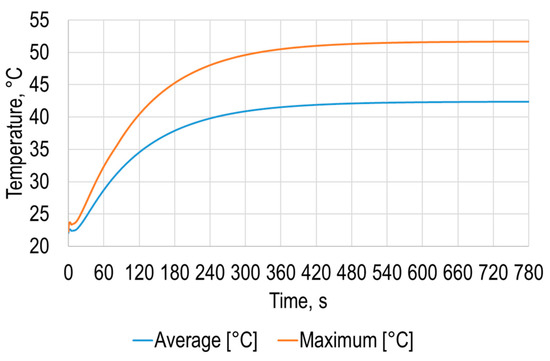 The simulation results allowed to determine the average and maximum dependence of the polymer sheet surface temperature on time (Figure 3), from which it can be seen that the sheet surface temperature changes nonlinearly over time until it settles.
