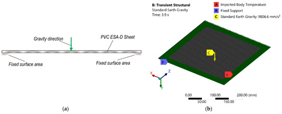 In this section the analytical research results of the sheet forming process parameters—heating temperature dependency from time and displacement of polymer sheet from gravity are presented. By using Ansys Transient Thermal together with Transient Structural analysis, a computational FE model of the PVC Trovidur ESA-D sheet, which geometric dimensions and properties of the elements used for the numerical calculations are collected in Table 1, was created.