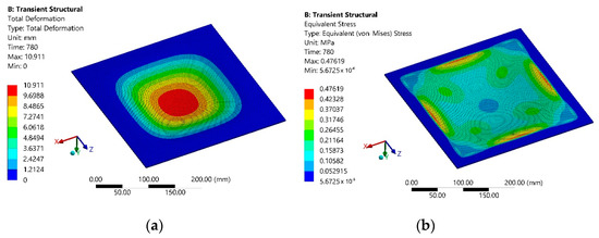 The simulation results of the total deformation of the polymer sheet after 780 s from the start of heating are presented in Figure 5a, and the equivalent Von Mises stress dependencies at the same instance are presented in Figure 5b.