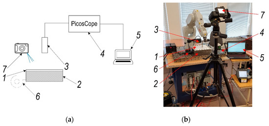 Experimental set-up for polymer sheet forming parameters validation: (a) scheme; (b) set-up view: 1—PVC ESA-D polymer sheet, 2—holding frame, 3—laser displacement meter Kyence LK-G82/3001 (Keyence Corporation, Neu-Isenburg, Germany), 4—digital oscilloscope PicoScope-6403 (Pico Technology Ltd., Cambridgeshire, UK), 5—PC, 6—hot air blowing system CT-850D (Acifica, Inc., San Jose, CA, USA), 7—thermal imaging camera FLIR T450sc (FLIR Systems Inc., Wilsonville, OR, USA).